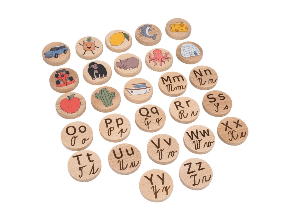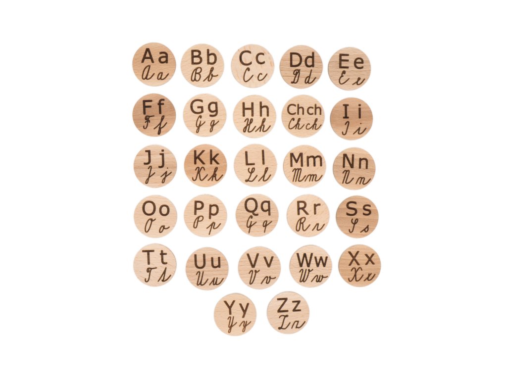 Pokročilý set české abecedy, který děti hravou cestou seznámí s písmeny jak tiskacími, tak psacími. Díky jednoduchým dřevěným kolečkům si osvojí tvary velkých a malých písmen, tiskacích i psacích. Procvičí si také paměť i jemnou motoriku – přirozeně a v duchu Montessori.